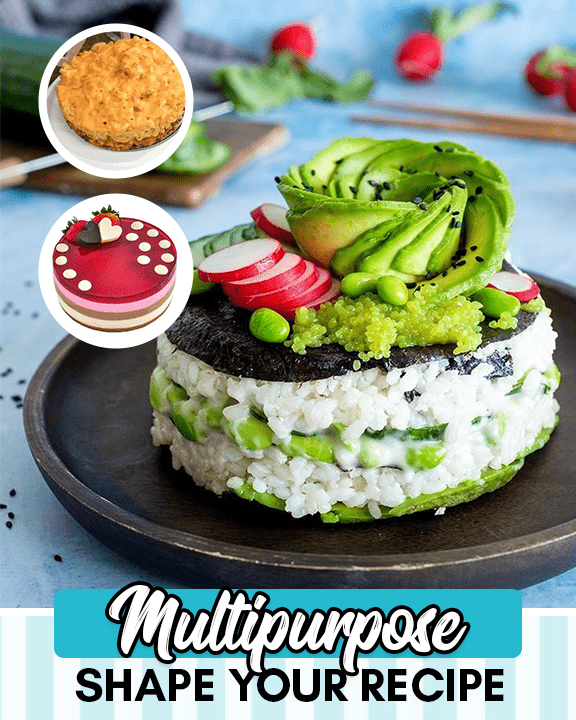This multipurpose mold set creates a wide range of confectionaries, pastries, vegetable cakes, patties and more.